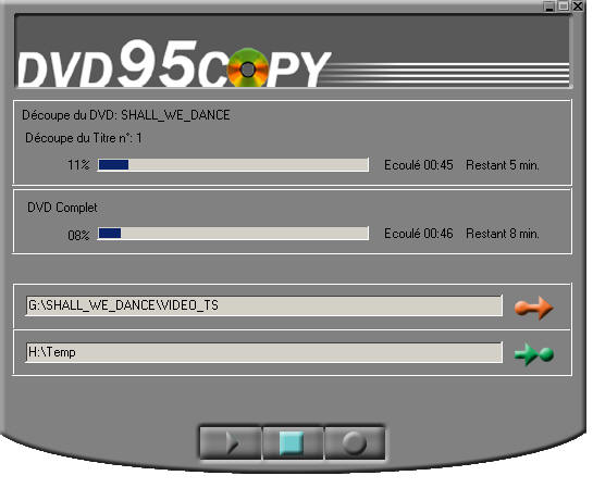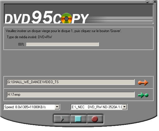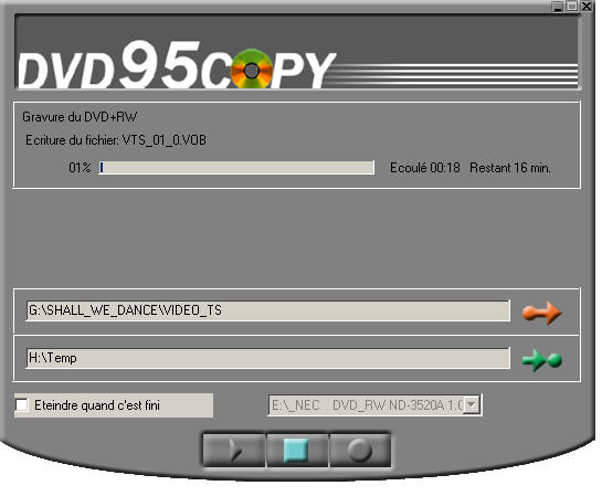 L'image ci-dessous illustre la manoeuvre, où 'G:\SHALL_WE_DANCE\VIDEO_TS' est le dossier source situé sur le disque dur, et 'E:\_NEC' est le graveur DVD de destination.