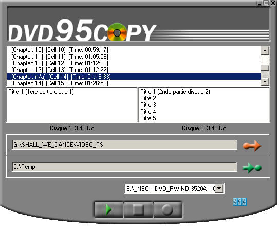 L'image ci-dessous illustre la manoeuvre, où 'G:\SHALL_WE_DANCE\VIDEO_TS' est le dossier source situé sur le disque dur, et 'E:\_NEC' est le graveur DVD de destination.