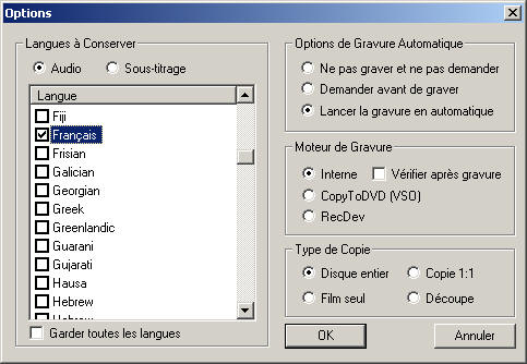 Dans cette fenêtre, il est important que vous sélectionniez les Langues à Conserver pour le son et les sous-titres.